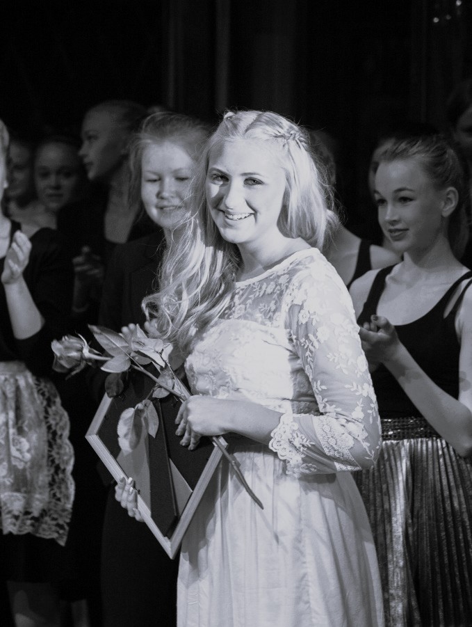 2011 började hon dansa hos oss här på Luleå Rytmik & Balettförening. Sedan dess har vi med nöje följt hennes fantastiska utveckling som dansare. Med sin målmedvetenhet och disciplin visar hon att allt är möjligt. Hon är mycket seriös och engagerad och gör alltid sitt yttersta, en förebild och inspiration för andra elever.'