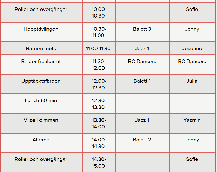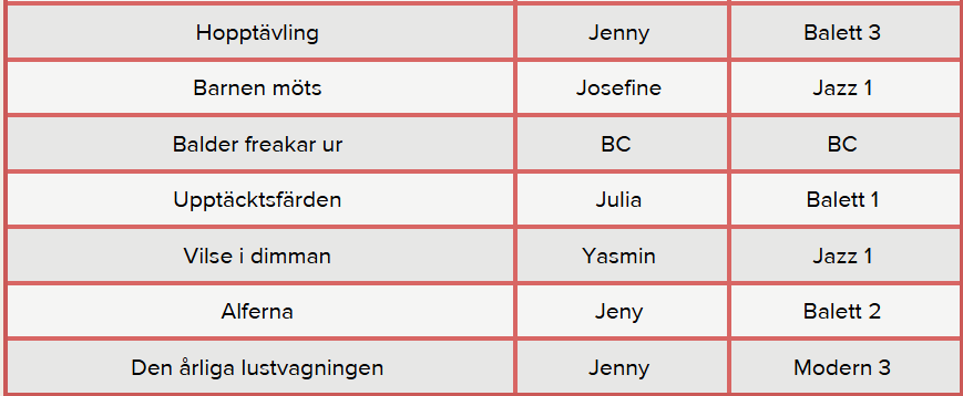 Samling: Din danslärare kommer att informera var och när er grupp ska samlas.