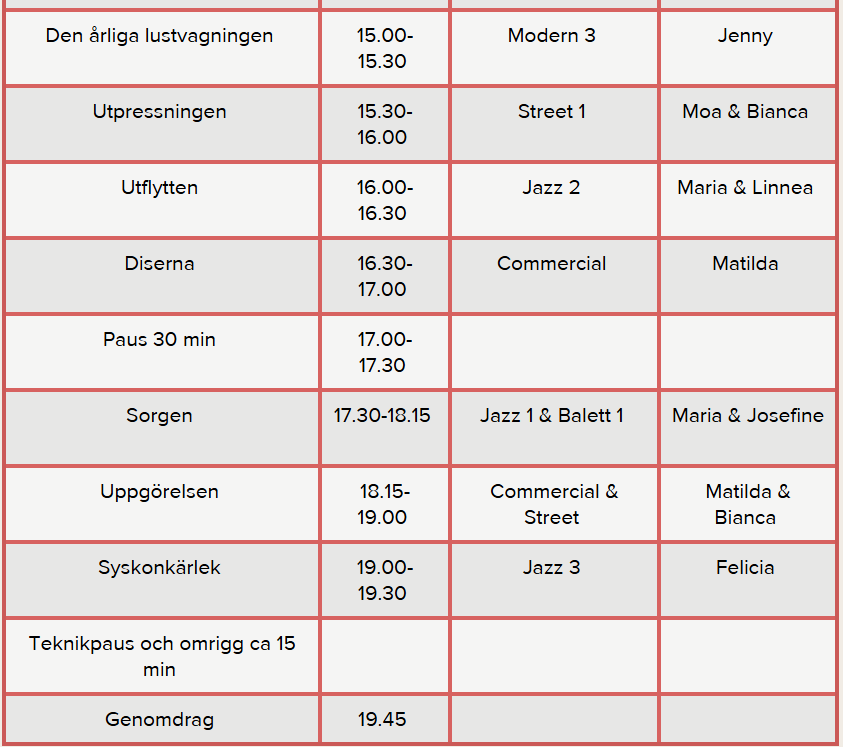 Nedan hittar du all information gällande datum och tider för repetitioner och föreställningstider för showen "Freja".